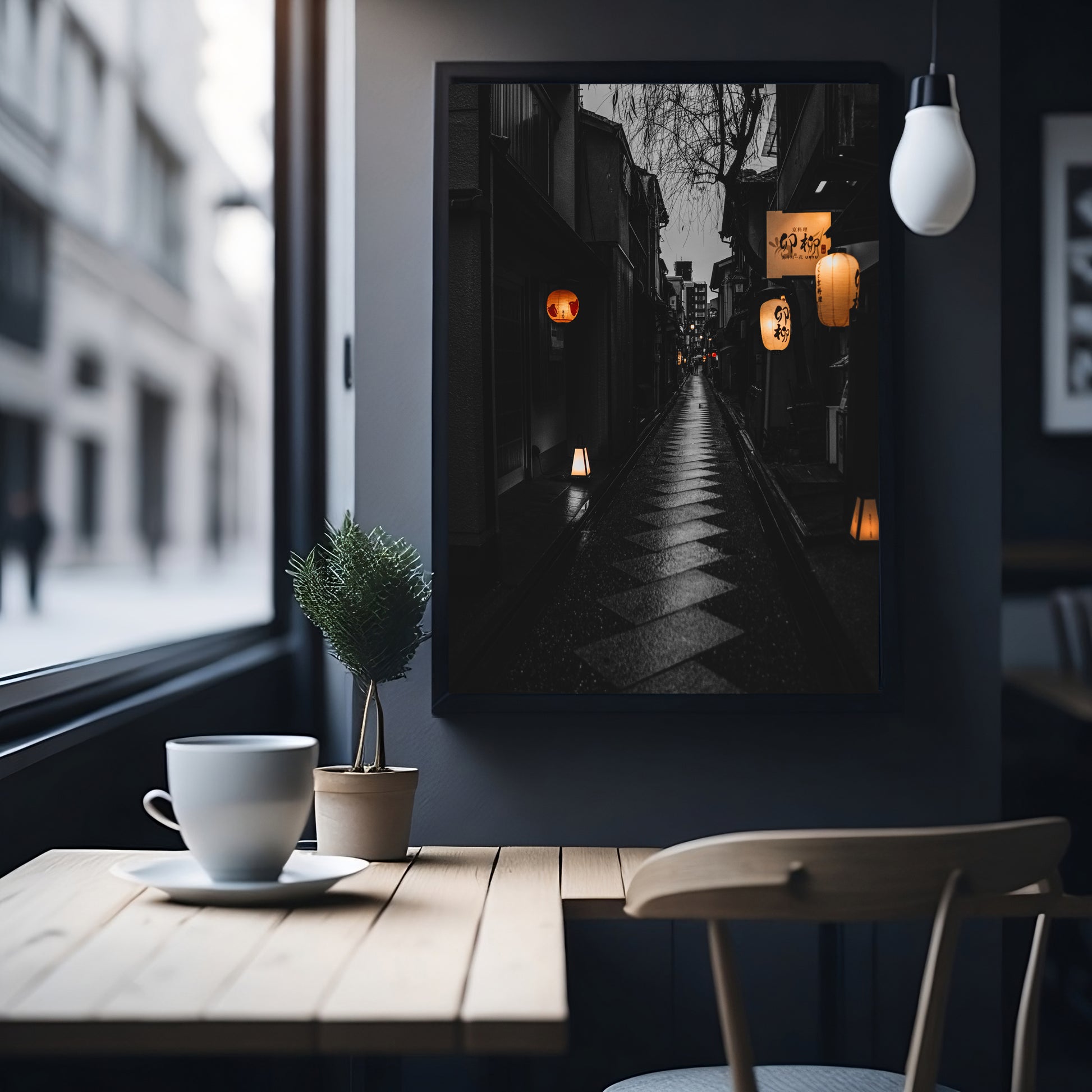 Eine der schmalen Gassen Kyotos, fast menschenleer nach dem Regen.
